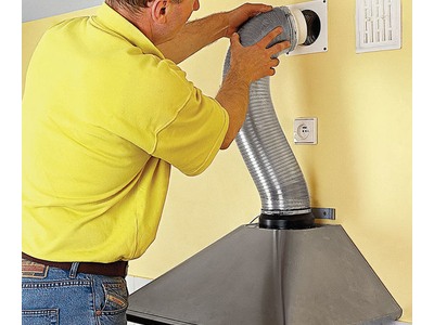 Если вы выбрали встраиваемый тип конструкции, специалисты проведут монтаж горизонтальной вытяжки внутрь маскировочного короба или настенного шкафчика. Для вертикальных моделей обычно требуется проделывать специальные ниши. Обязательно учитывается расстояние от кромки прибора до рабочей поверхности плиты (это требование безопасности). Воздуховод формируют из гофры или трубы из пластика — гибкая система монтируется легче, ведь она принимает любую форму.